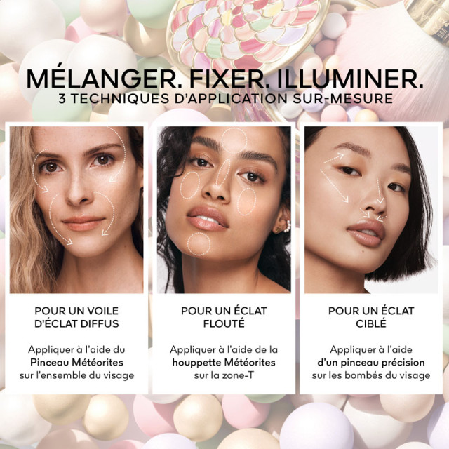 Prélever la poudre en mélangeant les perles avec le pinceau Météorites¹ et l’appliquer sur l’ensemble du visage pour un éclat diffus.