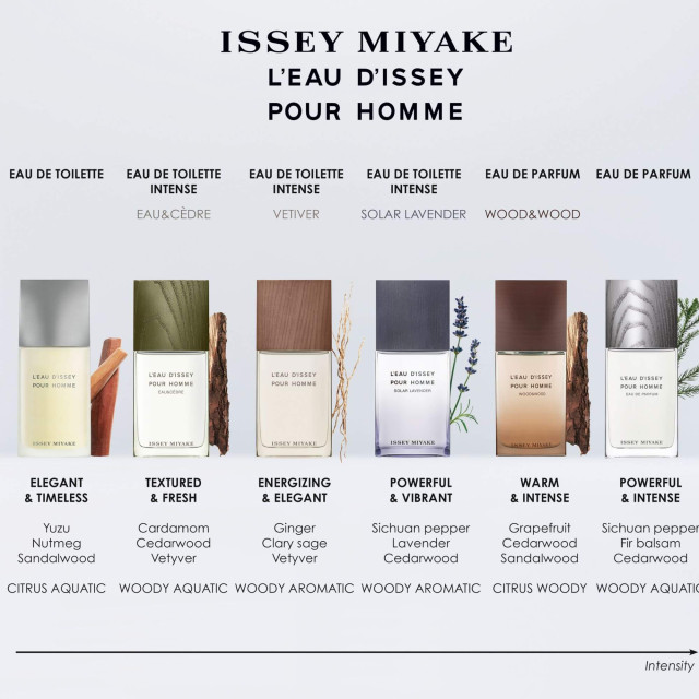 L'eau de toilette l'eau d'Issey est un boisé aquatique épicé qui doit sa vigueur à sa note de tête de yuzu. Les hommes à la virilité marquée apprécieront son cœur épicé et boisé avec la présence du nénuphar et de la muscade. Le sillage, intense, propose des notes d'ambre tabac et de bois de santal, ce qui procure un fond énergique et profond.