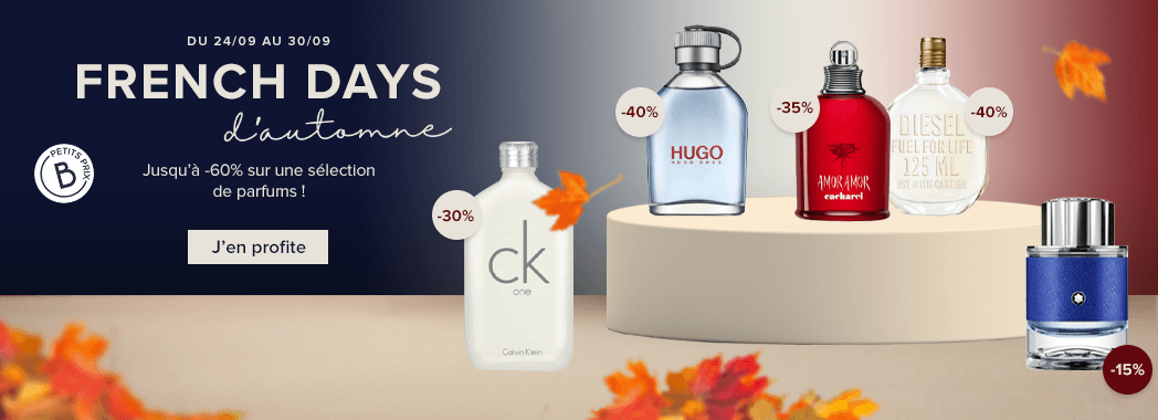 Les French Days sont là, et c’est le moment parfait pour vous faire plaisir ! Parfums emblématiques, coffrets soin raffinés, rouges à lèvres iconiques… Retrouvez vos essentiels beauté à prix doux et laissez-vous tenter par des offres exclusives.