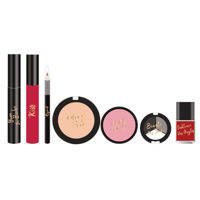 Composé de : 1 mascara, 1 rouge à lèvres liquide, 1 crayon yeux, 1 highlighter, 1 fard à joues, 1 mini palette 3 fards à paupières, 1 vernis à ongles.