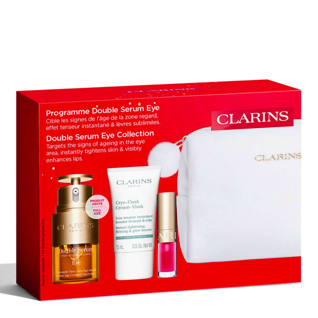 Ce coffret offre les soins essentiels pour avoir un visage et un regard éclatants. Découvrez l'expert jeunesse Double Serum Eye qui cible les signes de l'âge du contour de l'oeil, à la texture fondante si sensorielle. Il aide à réduire les ridules, les pattes d'oie et à raffermir la peau délicate du contour des yeux pour une apparence plus jeune et revitalisée. L'incontournable Cryo-Flash Cream-Mask à l'effet tenseur instantané qui agit sur l'éclat de la peau. Grâce à sa technologie inspirée de la « cryothérapie » c’est le masque anti-âge avec effet tenseur immédiat pour une peau plus ferme et plus lumineuse. Pour une signature beauté à couper le souffle : l'addictif Lip Comfort Oil offre à la fois une bouche brillante à croquer et des lèvres hydratées.