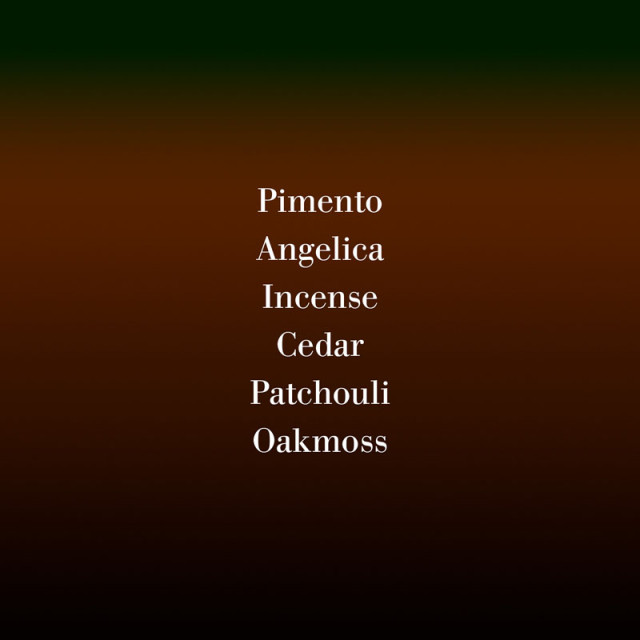 La fraîcheur épicée des fleurs de pimiento, d'angélique et de genièvre se fond dans une mer boisée de cèdre, de patchouli et de vétiver, liée par le galbanum et l'encens, dans une mystérieuse mise en valeur du parfum naturel de l'homme.