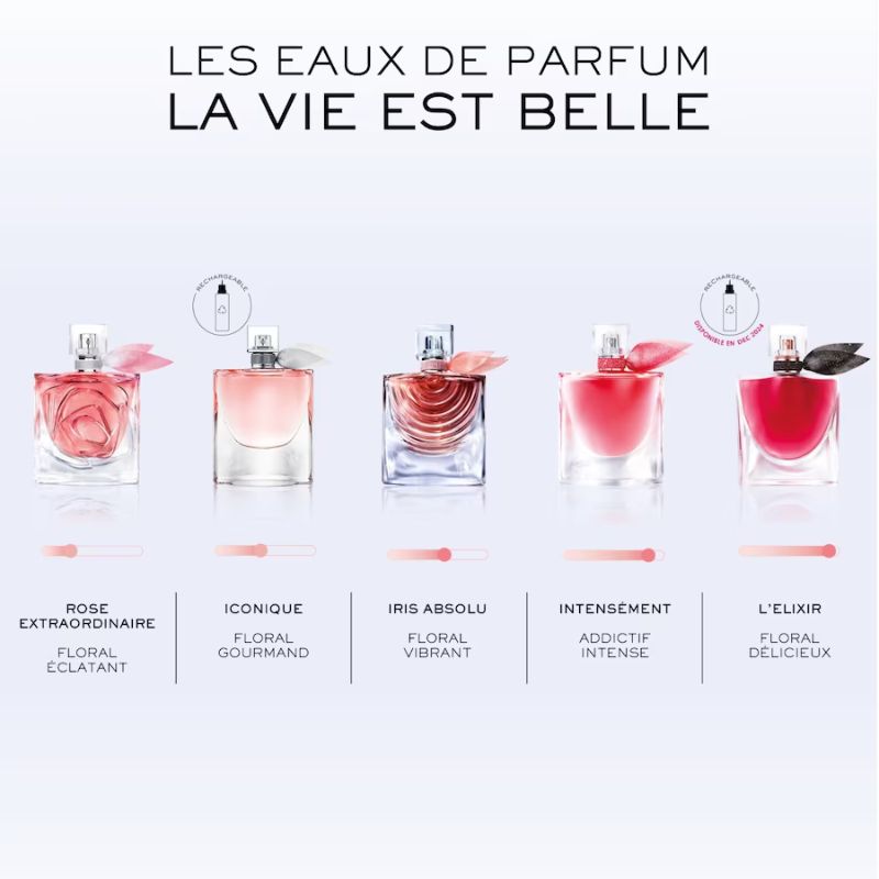 Pour satisfaire les odorats aiguisés des nombreuses adeptes du parfum La Vie est Belle, Lancôme a décliné son Eau de Parfum originelle en plusieurs jus : l’Eau de Parfum Elixir, l'Eau de Parfum Intensément ou encore la toute dernière création l'Eau de Parfum Vanille Nude.
